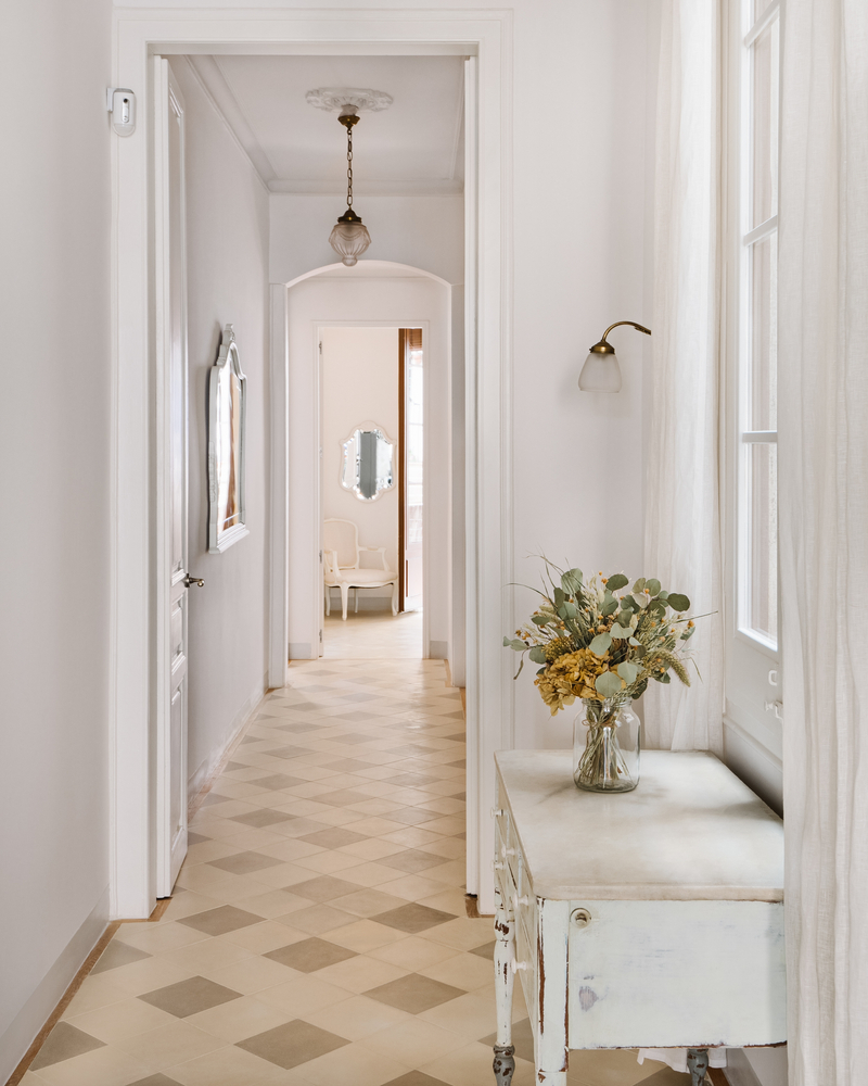 Play with the lighting of your hallway to take away the gloom of a confined, windowless space. This designer used a vintage pendant in the main hall with a complimentary sconce to create a cozy nook. These simple touches take the color palette and existing decor to round out “French countryside” vibes.